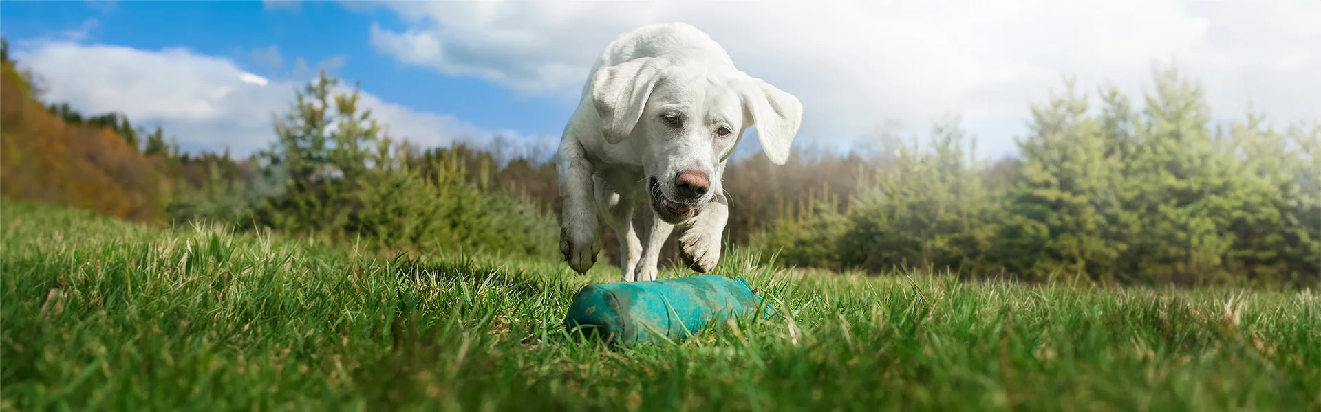 Ein weißer Labrador nähert sich einem Spielzeug auf einer grünen Wiese, mit Bäumen und einem teilweise bewölkten Himmel im Hintergrund.