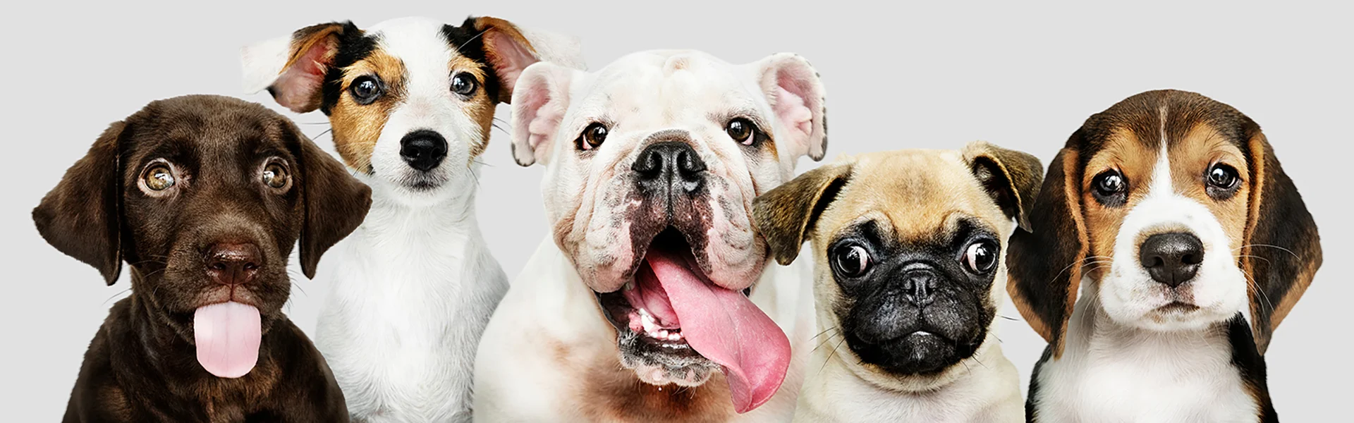 Fünf verschiedene Hunderassen nebeneinander, von links nach rechts: ein brauner Labrador Welpe mit herausgestreckter Zunge, ein Jack Russell Terrier, ein weißer Bulldogge mit rosa Zunge, ein Pug mit nachdenklichem Blick und ein Beagle Welpe, alle vor einem neutralen Hintergrund.